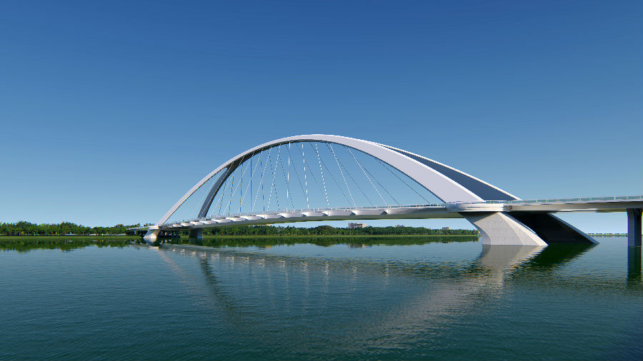 “撫音悅迎八方客,砥礪奮進(jìn)謀新篇”,寓意綿陽科技城在現(xiàn)代化建設(shè)歷程中,以開放、包容的姿態(tài)不斷迎接著新事物,開拓創(chuàng)新,與時(shí)代接軌互聯(lián)?!皳崆僮V韻”為主跨243m提籃拱,主拱猶如張開的風(fēng)琴般奏出美妙的音樂,簡約唯美。兩翼出挑的人行道猶如張開的雙臂,豐富行人感官體驗(yàn),與主拱共同譜寫出一曲浪漫的現(xiàn)代樂章,全橋視覺通透性好,有著強(qiáng)烈的韻律感。