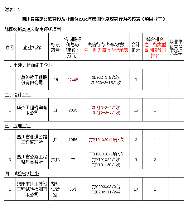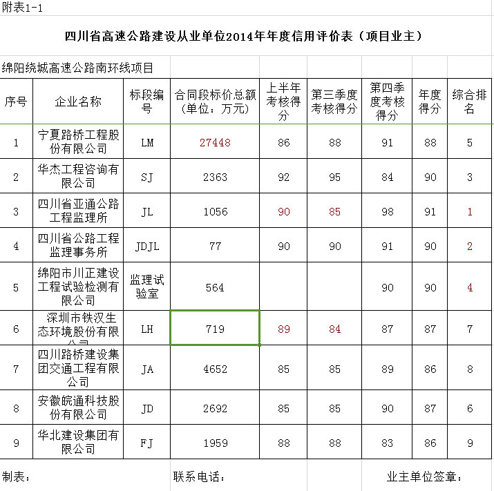 綿陽繞城高速公路南環(huán)線建設(shè)從業(yè)單位2014年年度信用評價和2014年第四季度履約行為考核結(jié)果公示