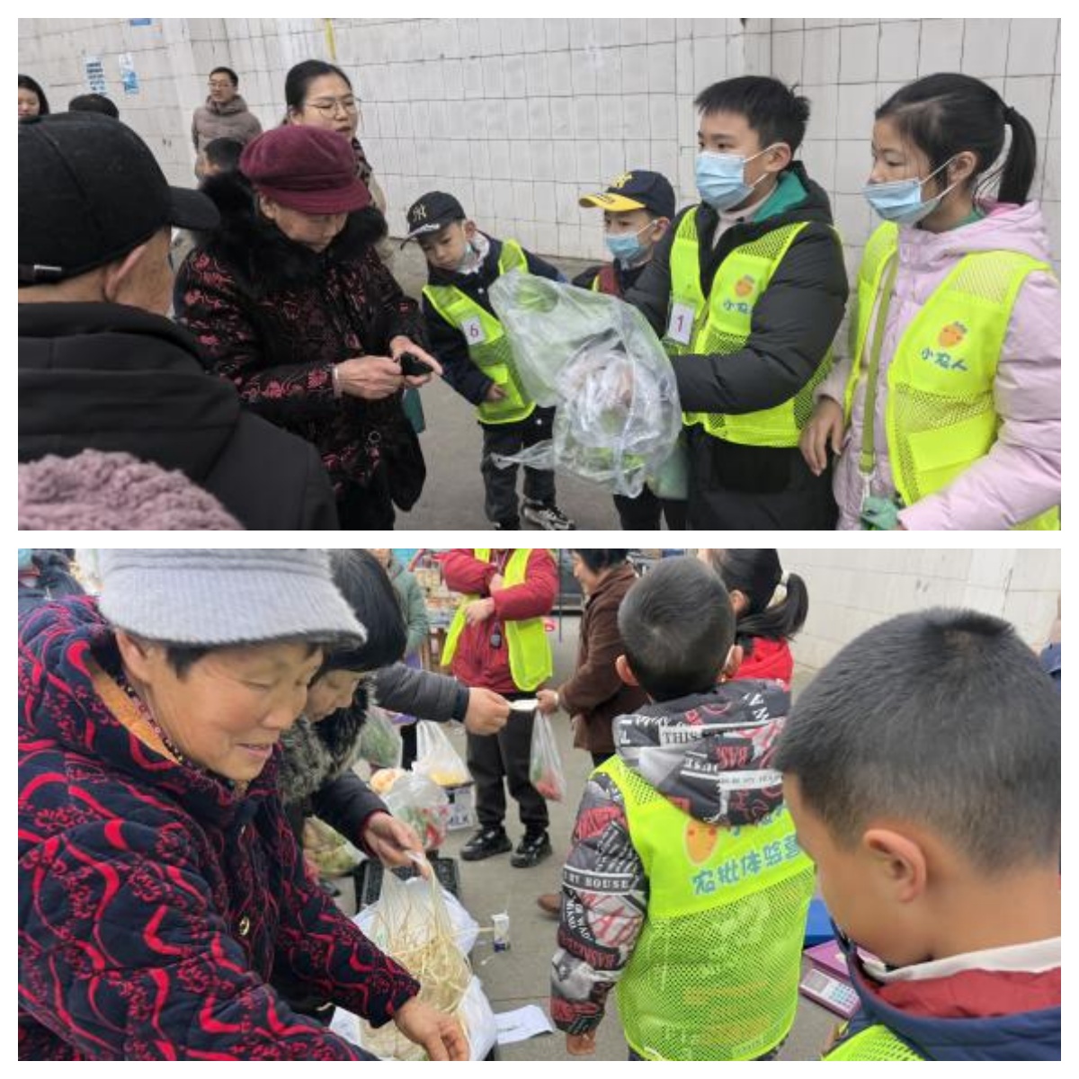 “蔬菜是怎樣從田間到餐桌的?”“不同種類蔬菜應該怎樣選購”。在認真聆聽了市場管理中心李強老師的講解后,小朋友們分成兩組,迅速商定好售賣品種后,立即投入緊張的采購任務中。他們穿梭于繁忙的攤位間,仔細挑選新鮮的蔬菜、討價還價、支付貨款,還自己動手裝袋、搬運。
