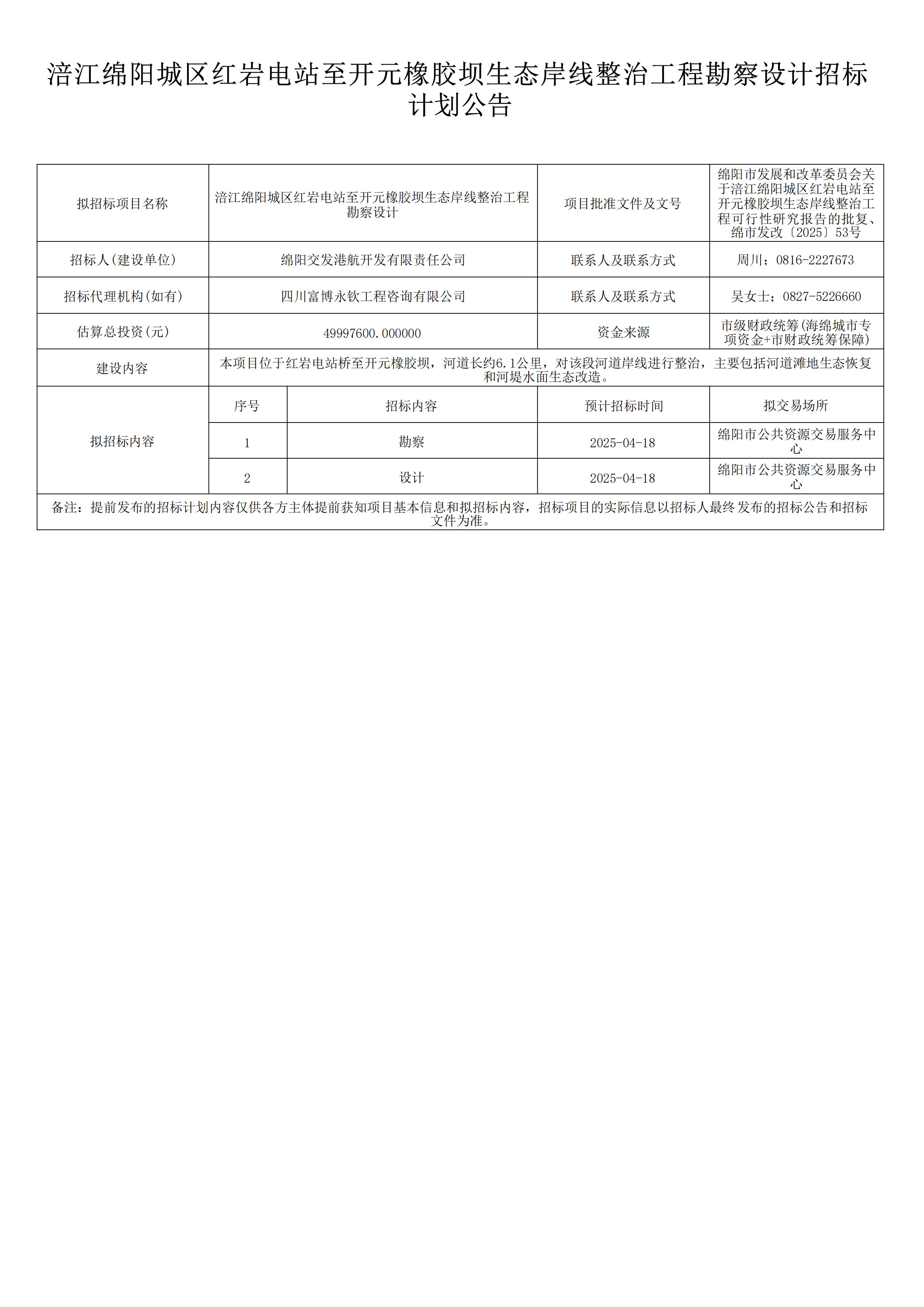 涪江綿陽城區(qū)紅巖電站至開元橡膠壩生態(tài)岸線整治工程勘察設計招標計劃公告