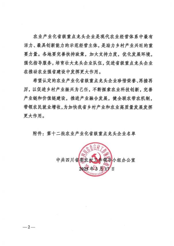 喜報(bào)!高農(nóng)司再度獲評(píng)四川省農(nóng)業(yè)產(chǎn)業(yè)化省級(jí)重點(diǎn)龍頭企業(yè)