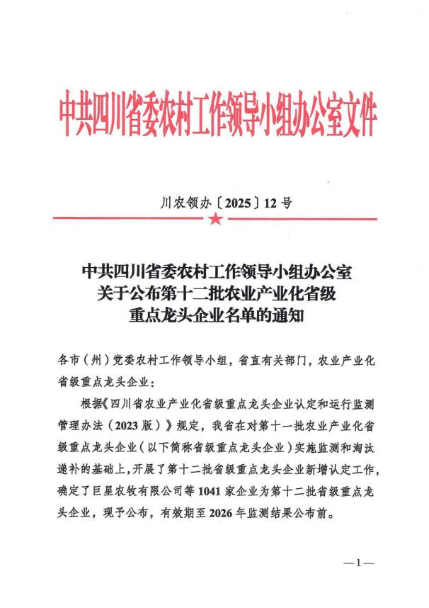 近日,中共四川省委農(nóng)村工作領(lǐng)導(dǎo)小組辦公室公布了第十二批農(nóng)業(yè)產(chǎn)業(yè)化省級(jí)重點(diǎn)龍頭企業(yè)名單,綿陽(yáng)市高水農(nóng)副產(chǎn)品批發(fā)有限公司憑借在農(nóng)業(yè)產(chǎn)業(yè)領(lǐng)域的卓越貢獻(xiàn),繼第十批、十一批入選后,再度成功獲評(píng)。這一成績(jī)充分體現(xiàn)了高農(nóng)司在農(nóng)業(yè)產(chǎn)業(yè)化領(lǐng)域的領(lǐng)先地位和示范作用,彰顯了企業(yè)服務(wù)“三農(nóng)”、助力鄉(xiāng)村振興的顯著成效。