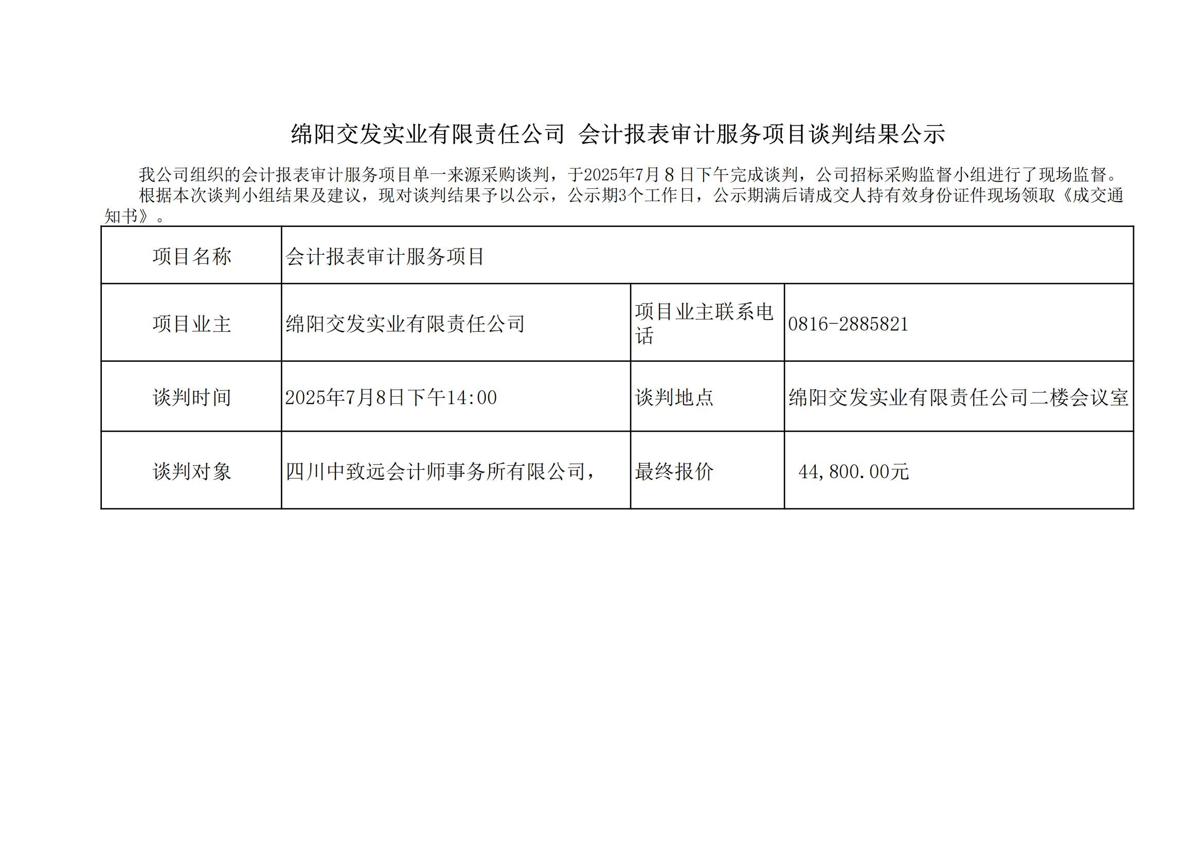 綿陽(yáng)交發(fā)實(shí)業(yè)有限責(zé)任公司會(huì)計(jì)報(bào)表審計(jì)服務(wù)項(xiàng)目談判結(jié)果公示