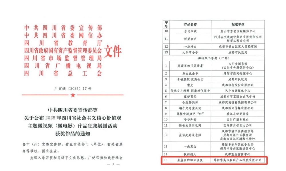 近日,由四川省委宣傳部聯(lián)合省委網(wǎng)信辦、省國資委、省總工會等七部門主辦的“2025年四川省社會主義核心價值觀微視頻(微電影)作品征集活動”評選結(jié)果正式公布。高農(nóng)司報送的的紀實微視頻——《菜籃里的綿陽溫度》,從全省數(shù)千部參賽作品中脫穎而出,榮獲三等獎,系綿陽市國資系統(tǒng)唯一獲此殊榮的民生題材作品。