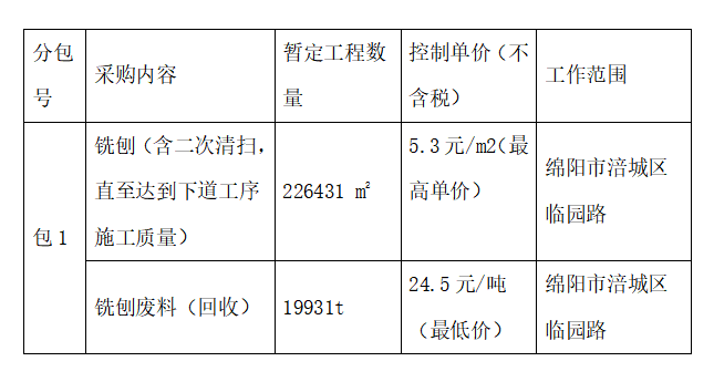 1、采購范圍:臨園路道路提升工程路面物資設(shè)備供應(yīng)服務(wù),包含銑刨、銑刨回收等物資設(shè)備的供應(yīng),共1個(gè)采購包,詳見附件1 :工程物資采購招標(biāo)控制價(jià)清單;
