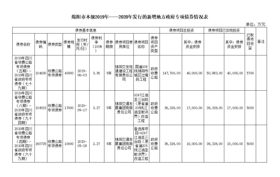 綿陽交通發(fā)展集團(tuán)有限責(zé)任公司關(guān)于綿陽市本級2019年——2020年發(fā)行的新增地方政府專項(xiàng)債券情況